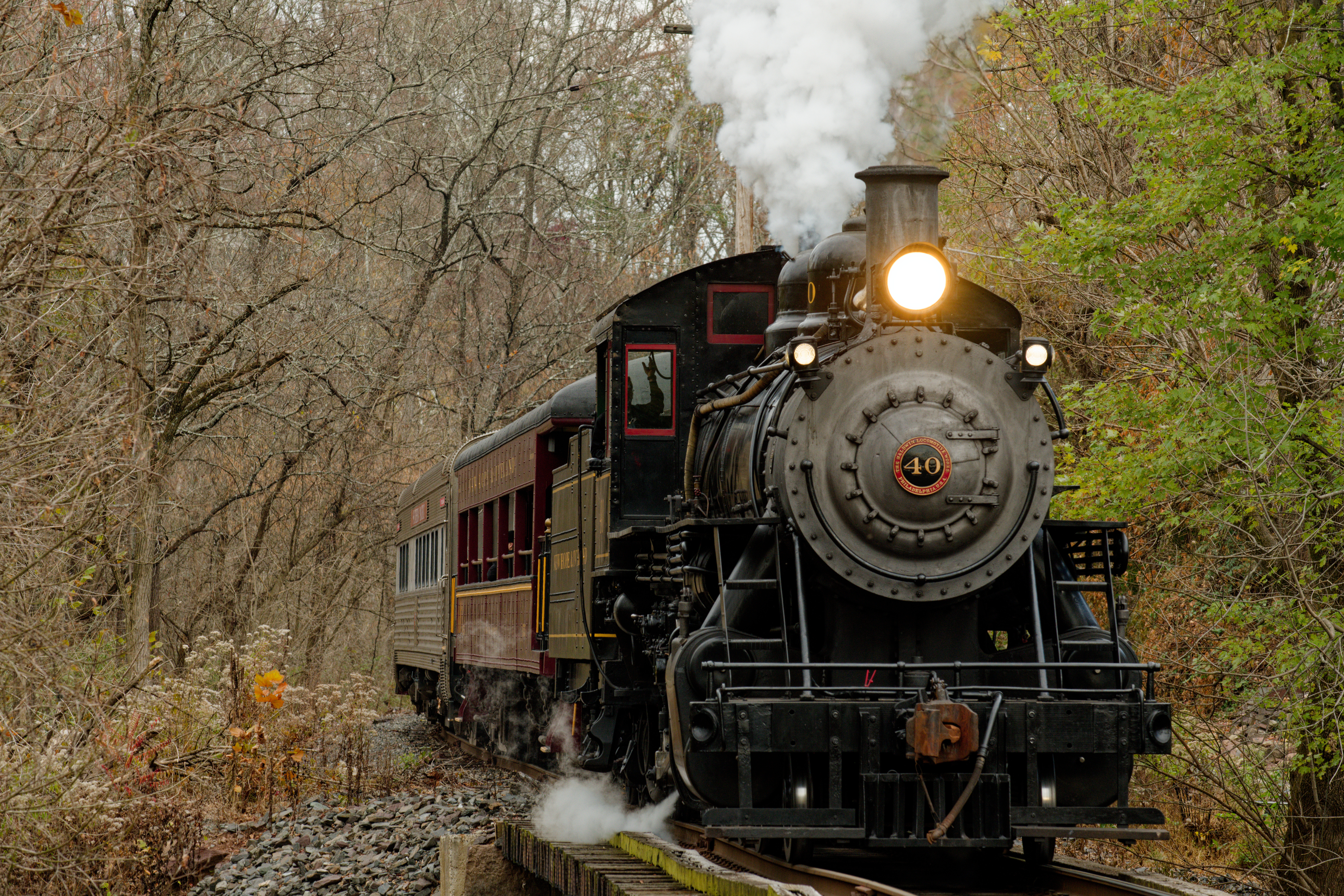 New Hope and Ivyland locomotive #40 on a fall foliage excursion, New Hope, PA, October, 2023.